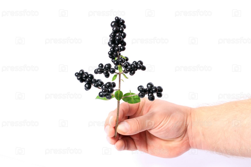 Рука держит ветку с черными ягодами, изолированная на белом фоне