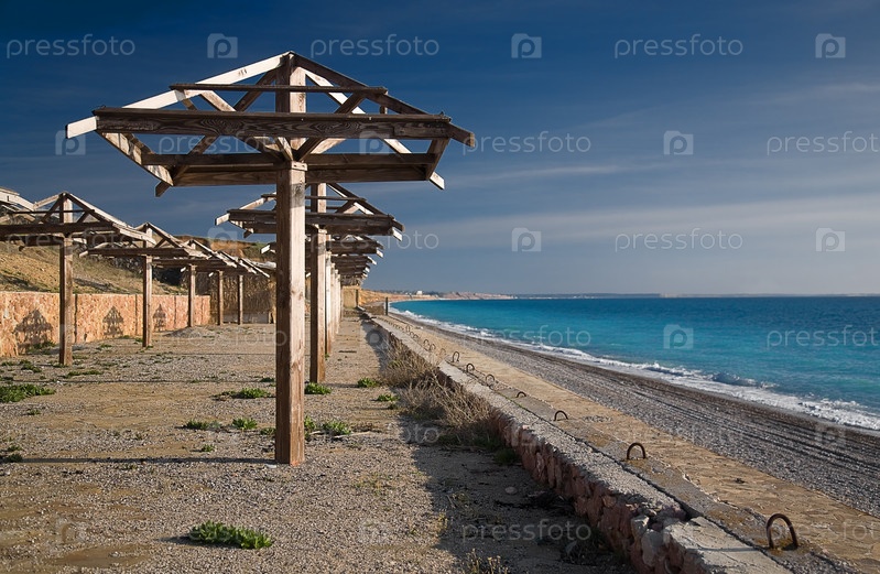 Ряд деревянных навесов от солнца на пляже