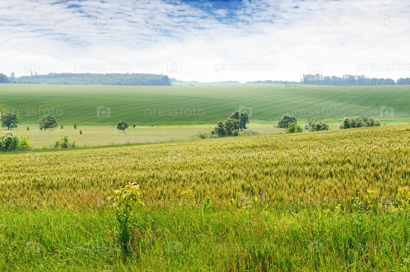 Зеленое поле и небо с легкими облаками