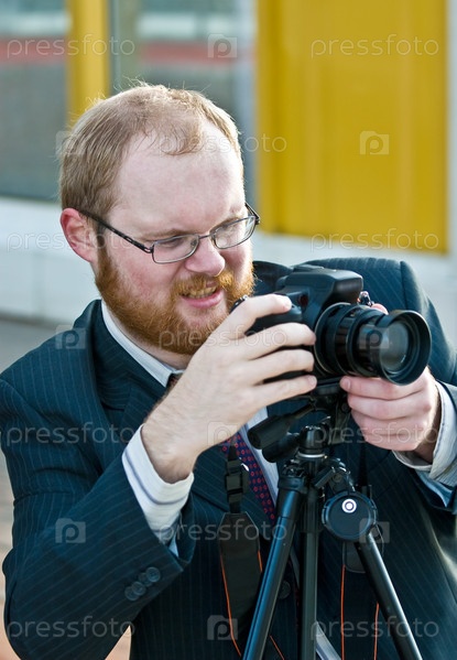 Портрет бородатого фотографа во время работы