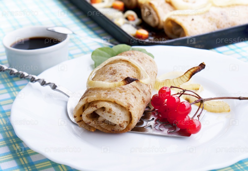 Аппетитные печеные блинчики с мясом и тушеными овощами