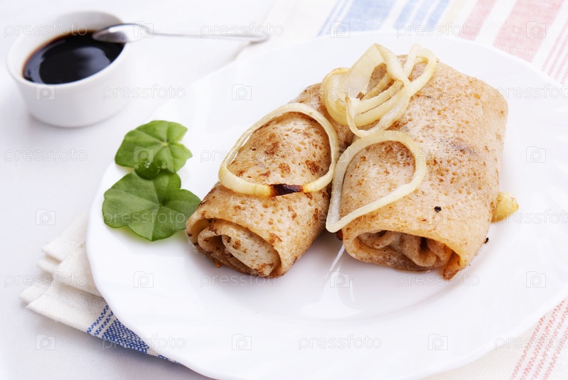 Жареные аппетитные блинчики с мясом и печеными овощами