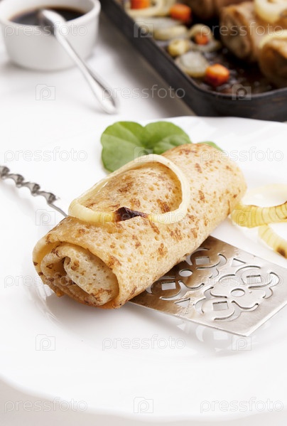Жареные аппетитные блинчики с мясом и печеными овощами