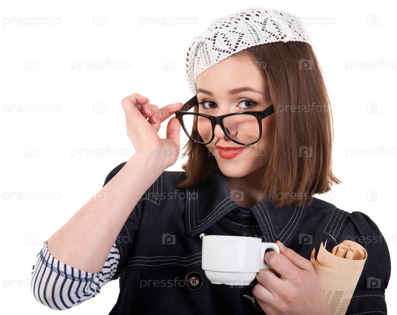 Симпатичная брюнетка с чашечкой кофе и газетами