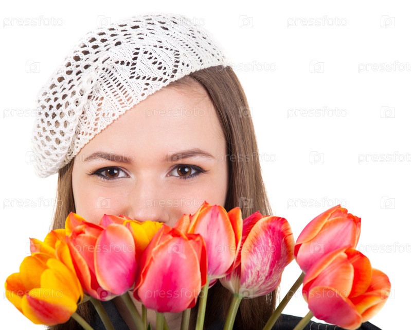 Симпатичная брюнетка с тюльпанами