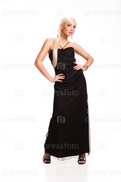 Блондинка в черном платье на белом фоне