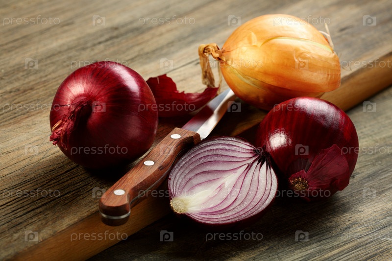 Нож, красный лук и половина луковицы