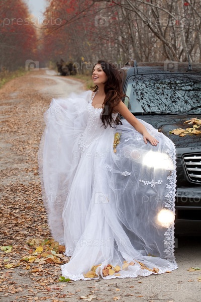 Молодая женщина в подвенечном платье стоит рядом с машиной в осеннем лесу