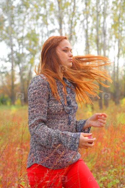Рыжая женщина гуляет в осеннем парке
