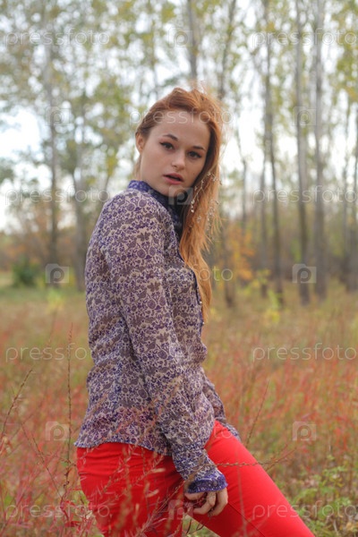 Рыжая женщина гуляет в осеннем парке