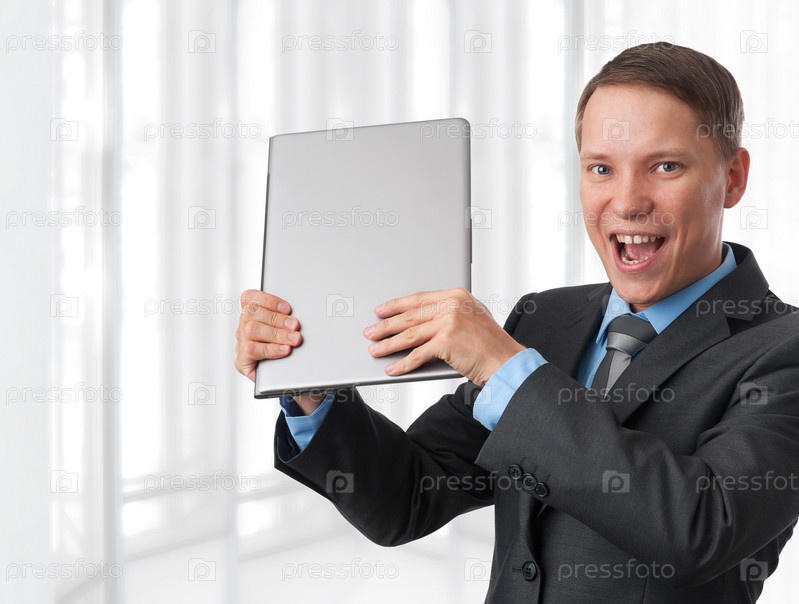 Радостный деловой мужчина с ноутбуком