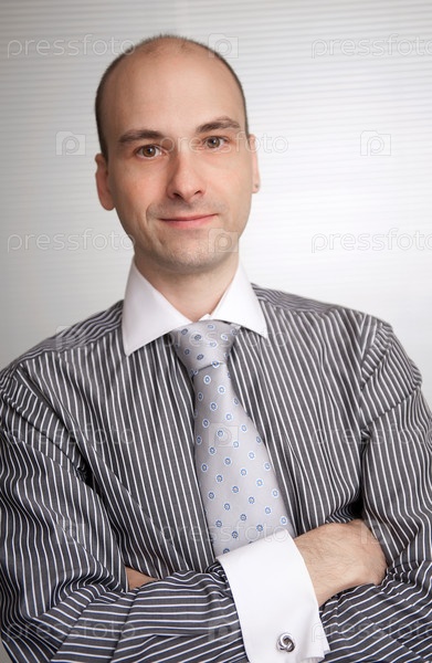 Портрет улыбающегося молодого бизнесмена, стоящего со сложенными руками