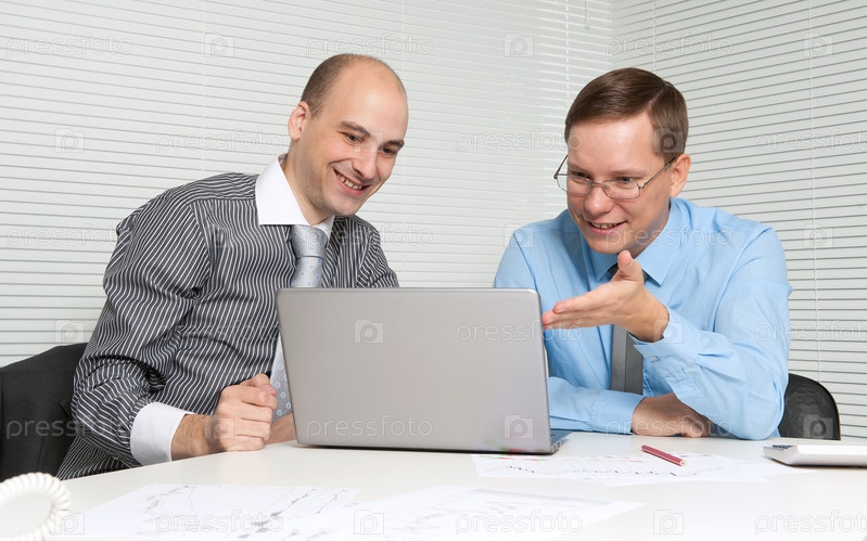 Двое деловых мужчин, работающих на ноутбуке