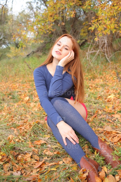 Портрет красивой рыжеволосой женщины, сидящей на траве
