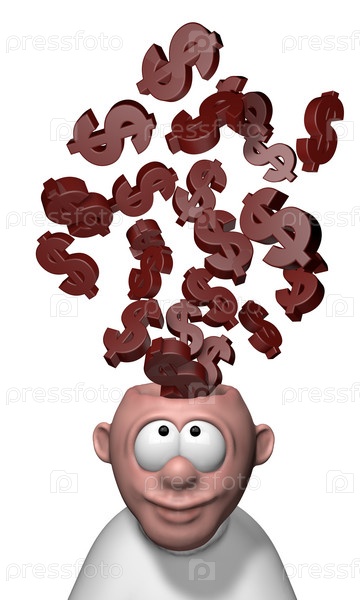 Человек с символами долларов на белом фоне - 3D иллюстрация