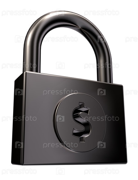 Замок с символом доллара на белом фоне - 3d иллюстрация