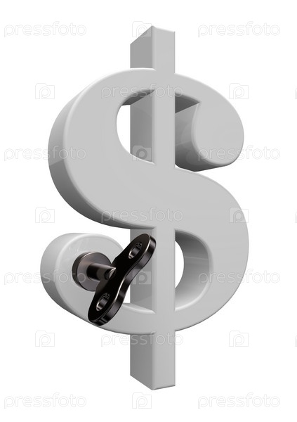 Псевсимвол доллара с ключом на белом фоне - 3d иллюстрация
