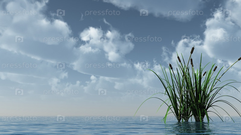 Камышовый тростник на воде под облачным небом - 3d иллюстрация