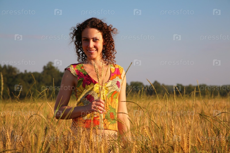Молодая женщина стоит на пшеничном поле
