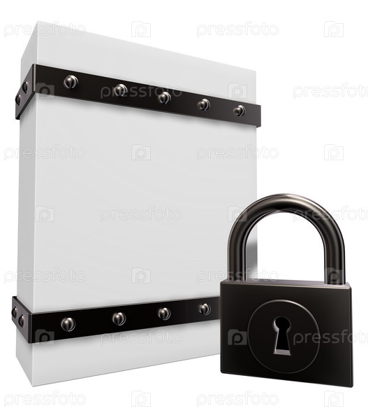 Пустая коробка с железными полосками и замком. 3D иллюстрация