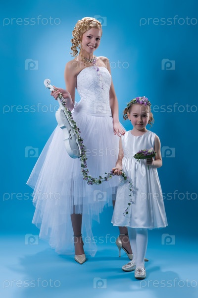 Молодая блондинка в свадебном платье и девочка с цветами