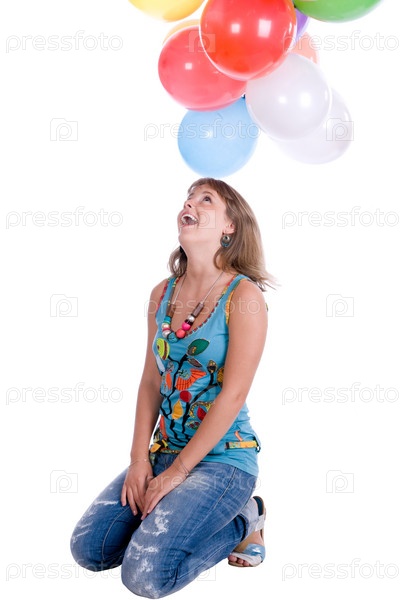 Счастливая девушка с разноцветными воздушными шарами на белом фоне