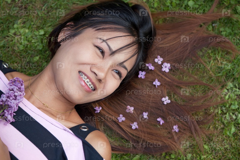 Тайская улыбающаяся женщина лежит на траве