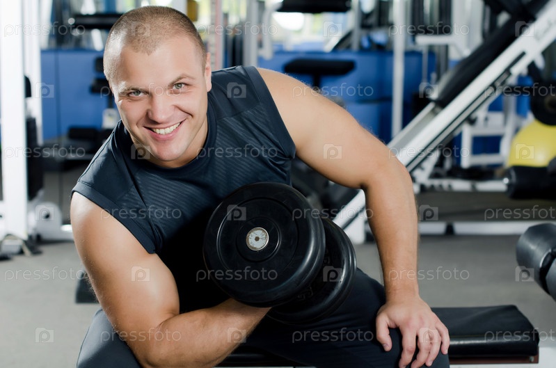 Мужчина с гантелью в спортивном клубе