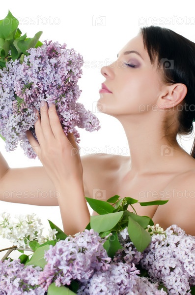 Красивая женщина с цветами сирени. Концепция ухода за кожей