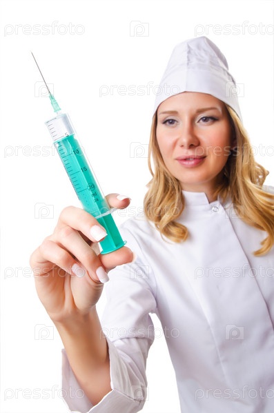 Женщина-врач со шприцем на белом фоне