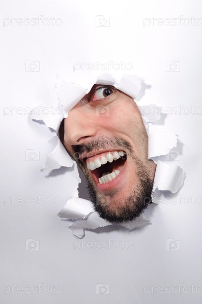 Мужское лицо через отверстие в бумаге