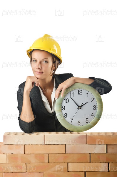 Молодая бизнес-леди с часами возле кирпичной стены