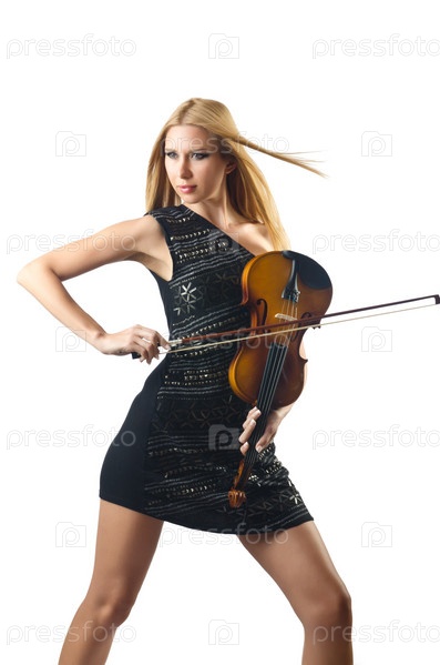Молодая девушка со скрипкой на белом фоне