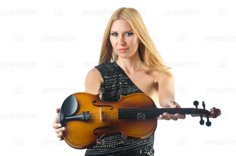 Молодая девушка со скрипкой на белом фоне