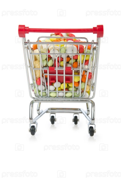 Корзина с разноцветными таблетками