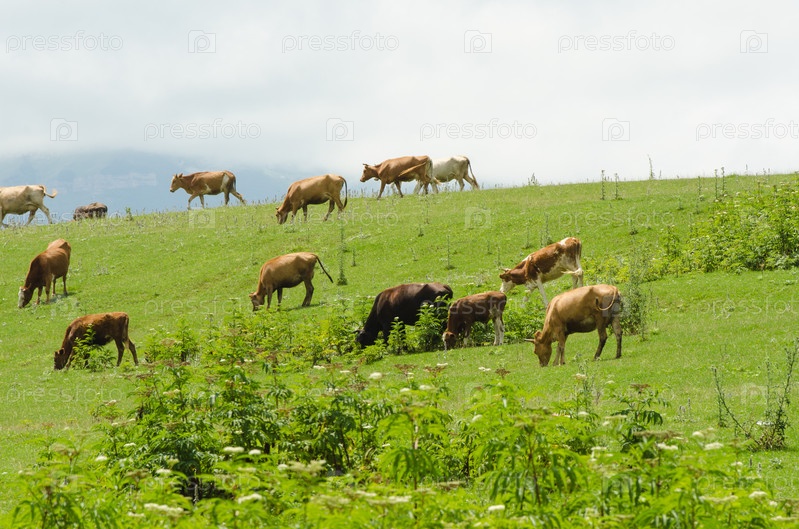 Коровы пасутся на зеленом поле