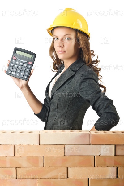 Концепция дорогого строительства с женщиной у кирпичной стены