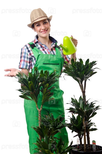 Молодая девушка поливает цветы