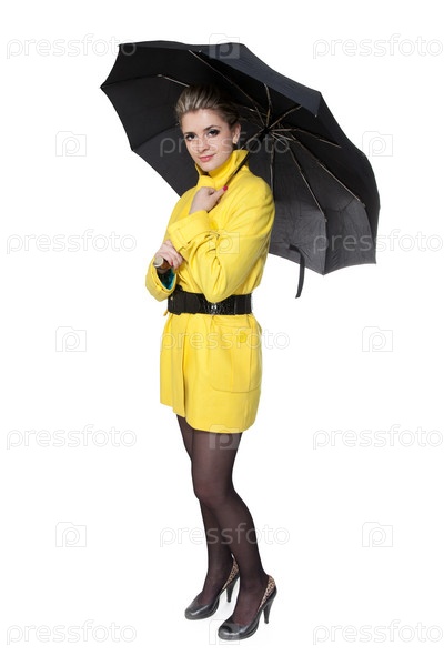 Женщина в желтом пальто, туфлях и с зонтиком