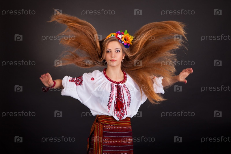 Красивая девушка с летящими каштановыми волосами. Женщина носит украинский национальный костюм