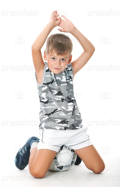 Мальчик держит футбольный мяч, изолированный на белом фоне
