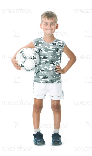 Мальчик, держащий мяч футбольный на белом фоне