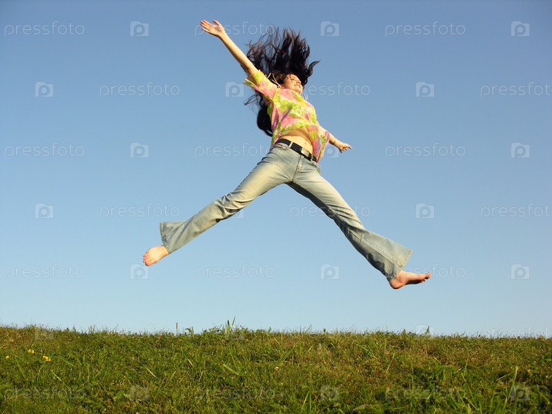 Скачущая девушка с волосами на голубом небе