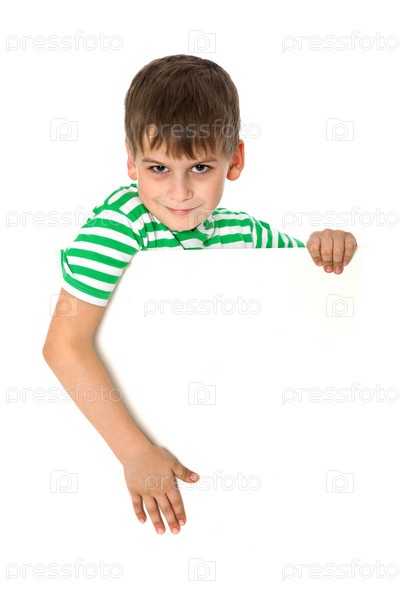 Мальчик держит баннер на белом фоне