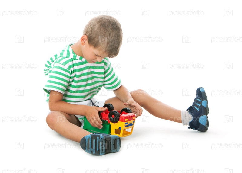 Мальчик с машинкой, изолированный на белом фоне