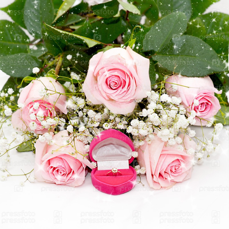 Нежные розовые розы и бриллиантовое кольцо