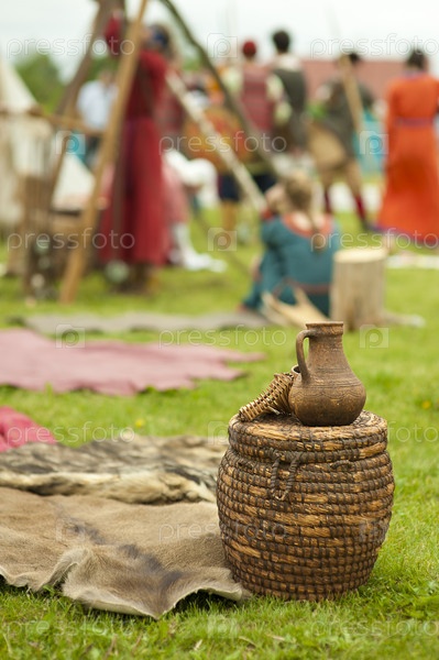 Старый глиняный кувшин на деревянной корзине
