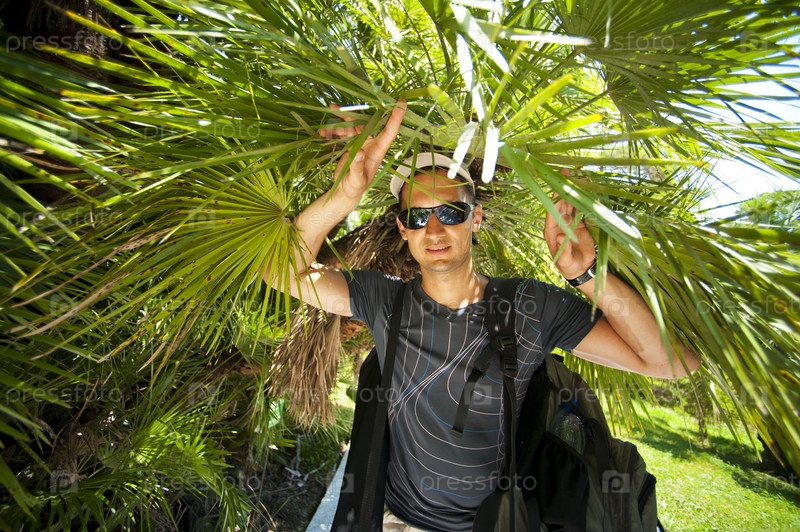 Молодой турист-мужчина в тропических джунглях
