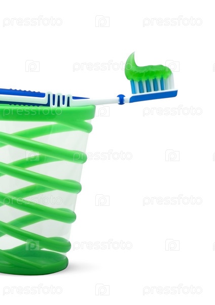 Зубная щетка на стаканчике на белом фоне