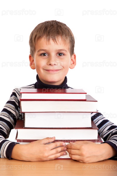 Школьник и куча книг на белом фоне